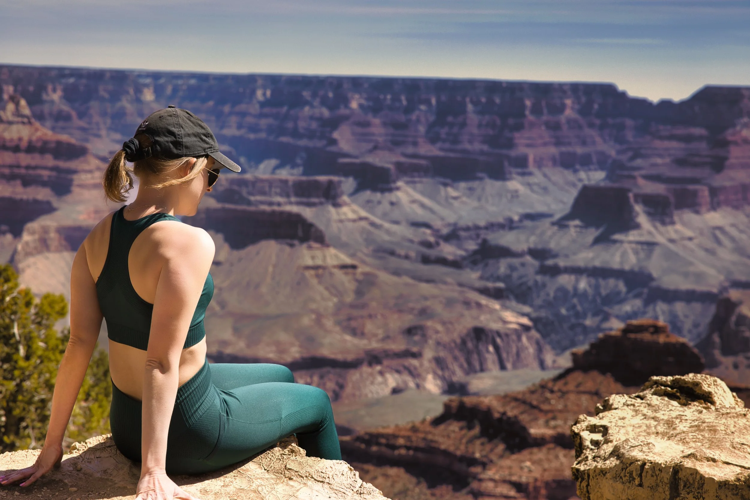 A woman in athletic wear sitting on a rock overlooking the Grand Canyon.